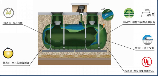 徹底解決了油品存儲的防腐問題 內(nèi)外層均采用FRP復(fù)合材料,永不銹蝕 中空間隙三維結(jié)構(gòu),整體性能優(yōu)異 不需昂貴的陰極保護,檢修周期長 重量輕,施工方便,安全可靠 無需為油罐鋪設(shè)混凝土基礎(chǔ),建設(shè)周期短,總體造價低 預(yù)制混凝土地錨,現(xiàn)場安裝省時 油罐遠離了微生物腐蝕和鐵銹,油品更干凈,提高了客戶滿意度的同時,增強企業(yè)競爭力。